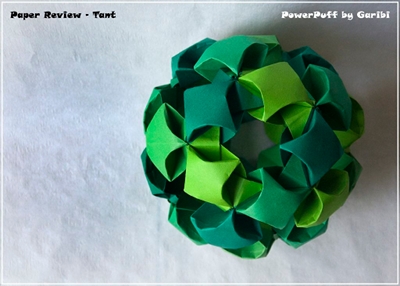 This is a perfect paper for modular work and particularly for this model. Puffing the units was easy, thanks to a surprisingly high bending resistance. The paper is also strong enough to hold a structure of 30 units and at this size it was very easy to get very accurate folding. The roughness of the surface creates a lot of friction, and the color palette allows having beautiful combinations. This is definitely my preferred paper for modular!