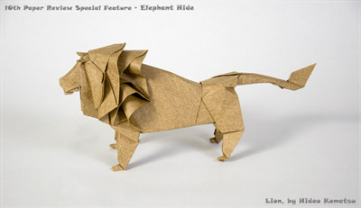 This paper has a wonderful texture, but it is not an easy task to fold and shape it. I used water-based varnish to enhance the texture and to strengthen the paper a bit, and it was still no easy task. Changing creases form mountains to valleys and vice versa is hard, and the paper tends to rip in the middle (between the “bumps”). Despite all these problems, the final lion looks amazing, although a bit weak and delicate, and the texture gives it a more realistic look.
