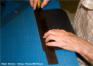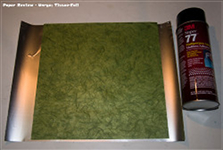 Making a sandwich from Unryu, foil, and another sheet of Unryu asks for accurate placing of the sheets. Although you can cut all three papers to the same size, this is not recommended. We suggest you cut the two sheets of Unryu a bit bigger than the foil. We again used the 3M 77 spray glue, so our sandwich consists of a layer of tissue paper, a layer of adhesive spray, another layer of adhesive spray (applied to the foil side), the foil itself, two more layers of glue, and the final layer of tissue paper - so all in all seven layers. You might think you will get a thick paper, but the result still feels like it's as thin as Elephant Hide.